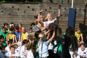 The entire school gathered around the edge of the playground, accompanied by all the staff and many parents to watch our annual ‘Clubs Display’. Having started several years ago as a Karate Display, the event has grown year on year to include our dance and gym clubs and latterly Mr Bruce’s band.