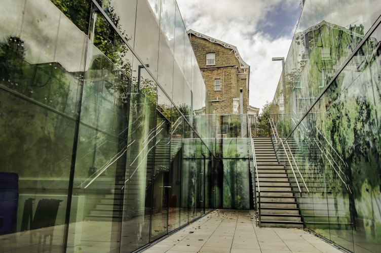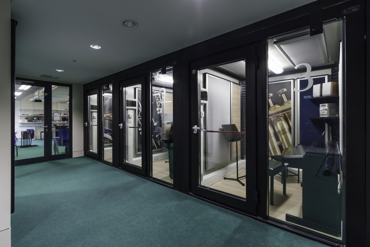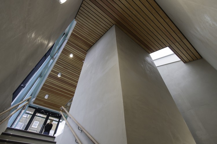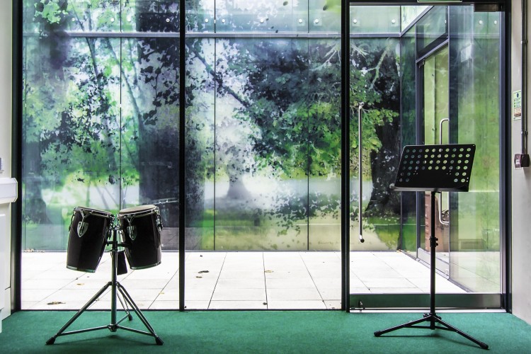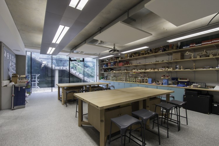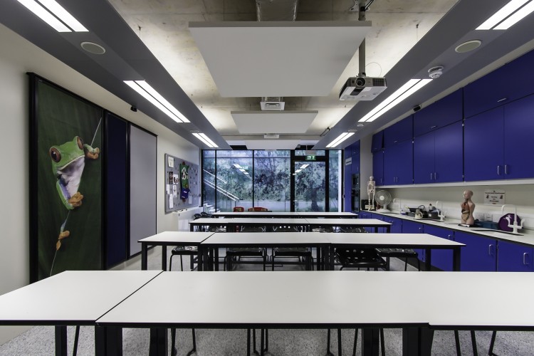 There are specialist classrooms for science, design and technology and music. The glass-lined stairwell decorated with trees, directs natural light into the underground classrooms.