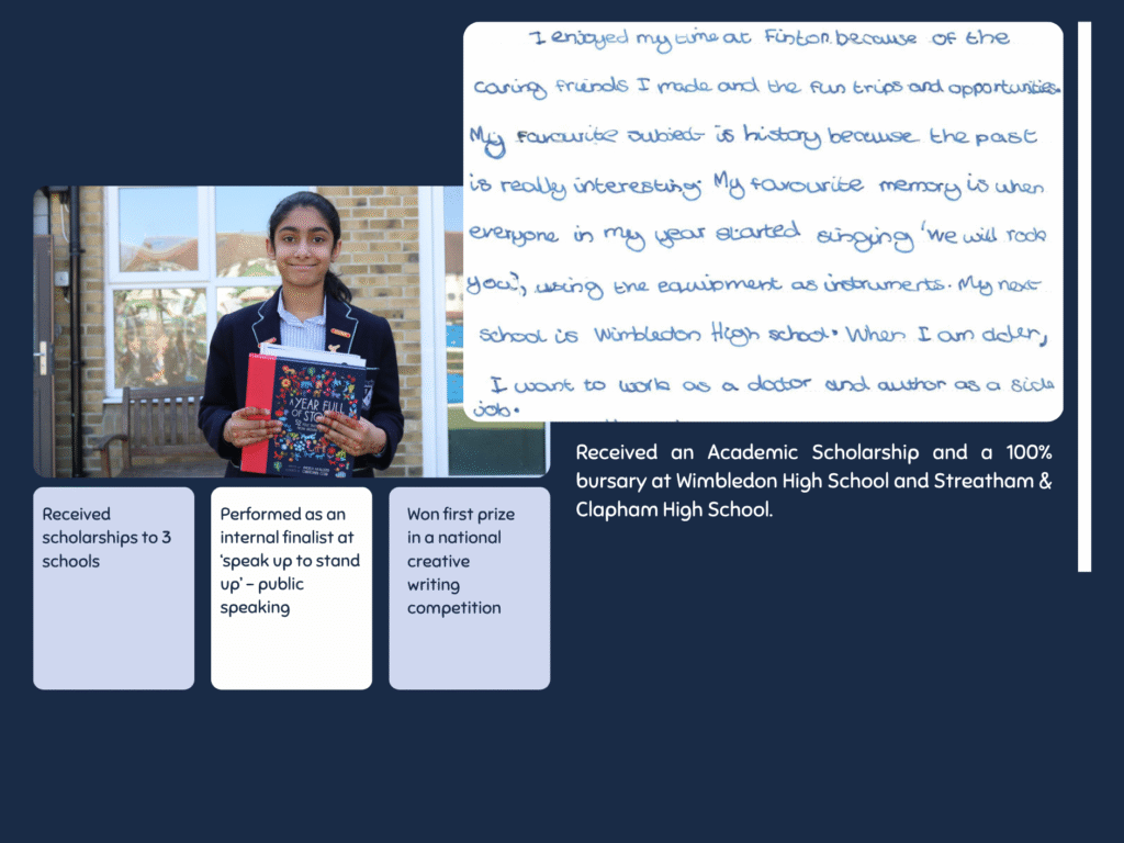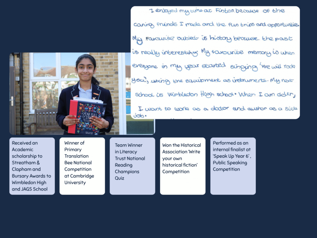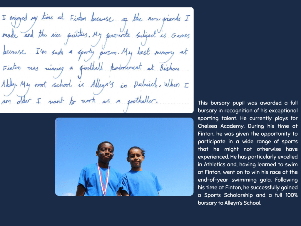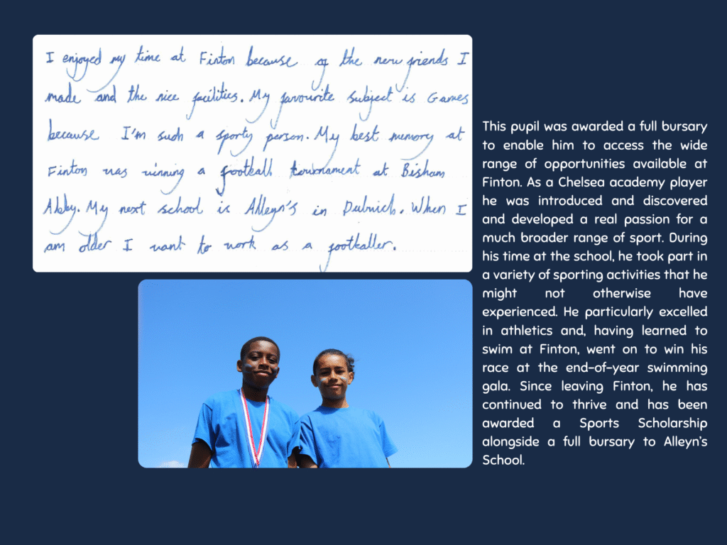 A central part of our charitable work is the Sally Walker Fund, established in honour of a much-loved former Headmistress. The Fund supports our Bursary Award, which offers children, aged seven and above, who may not otherwise have the opportunity, the chance to benefit from a Finton House education. These pupils make a lasting impact on school life by bringing their talents, perspectives, and experiences into our community.