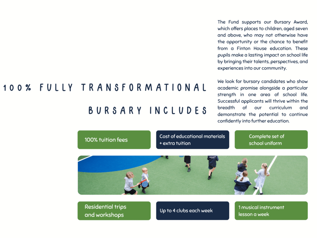 If you would like to find out more about our bursary programme, we would warmly welcome the chance to arrange a phone call or an informal meeting to discuss further. Please do not hesitate to get in touch with Charlotte Griffiths, Head of Marketing, Communications and Development, or with James Bashford, Development Governor at Finton House.